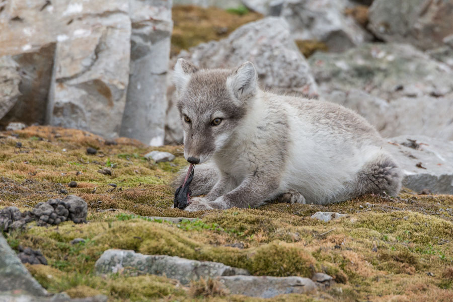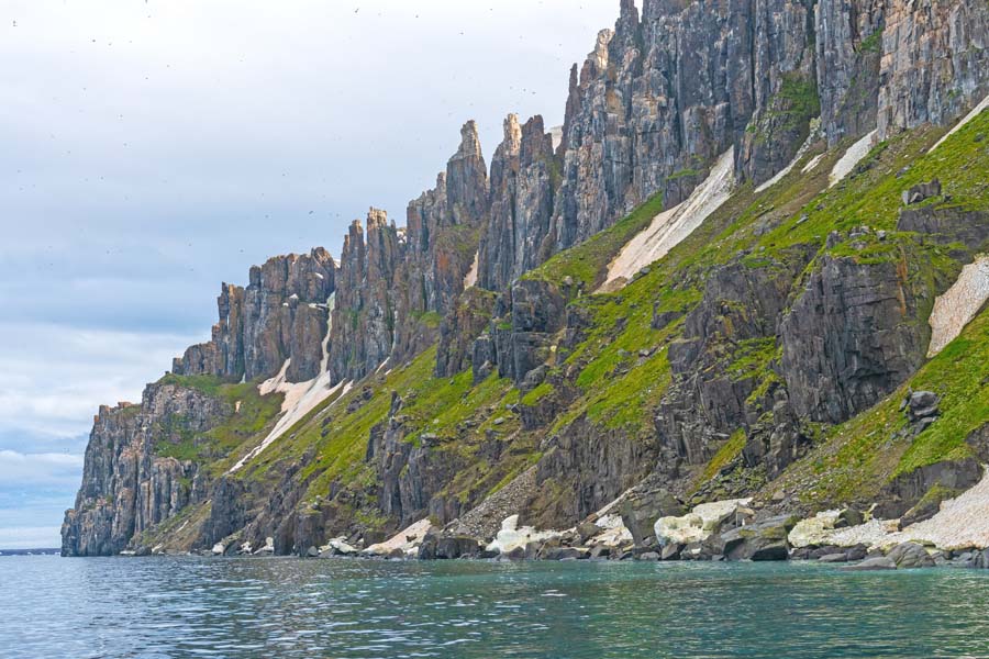 Today you find yourself in Bell Sund, one of the largest fjord systems in Svalbard. The ocean currents make this area slightly warmer than other areas in the archipelago, which shows in the relatively lush vegetation. Here there are excellent opportunities to enjoy both history and wildlife. A possibility is Ahlstrandhalvøya, at the mouth of Van Keulenfjorden, where piles of beluga skeletons can be found. These remains of 19th-century whale slaughter are a haunting reminder of the consequences of rampant exploitation. Fortunately, belugas were not hunted into extinction, and you have a good chance of coming across a pod. Alternately, while cruising the side fjords of Bellsund, you can explore tundra where reindeer like to feed as well as rock slopes where little auks are breeding.